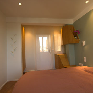 Rénovation complète, modification des réseaux. Création de mobiliers sur mesure pour la cuisine, les salles d'eau et la chambre. Modification de baies.